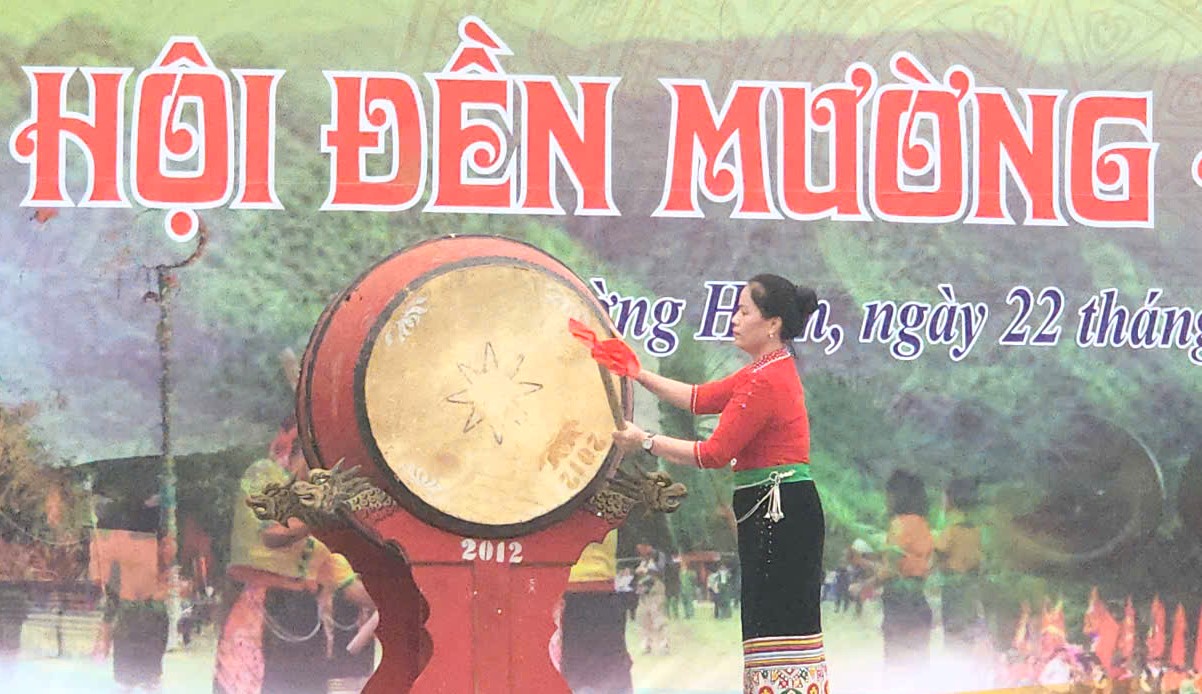Bà Lê thị Thuý Nga - Bí thư Đảng uỷ xã Mường Ham đánh trống khai hội