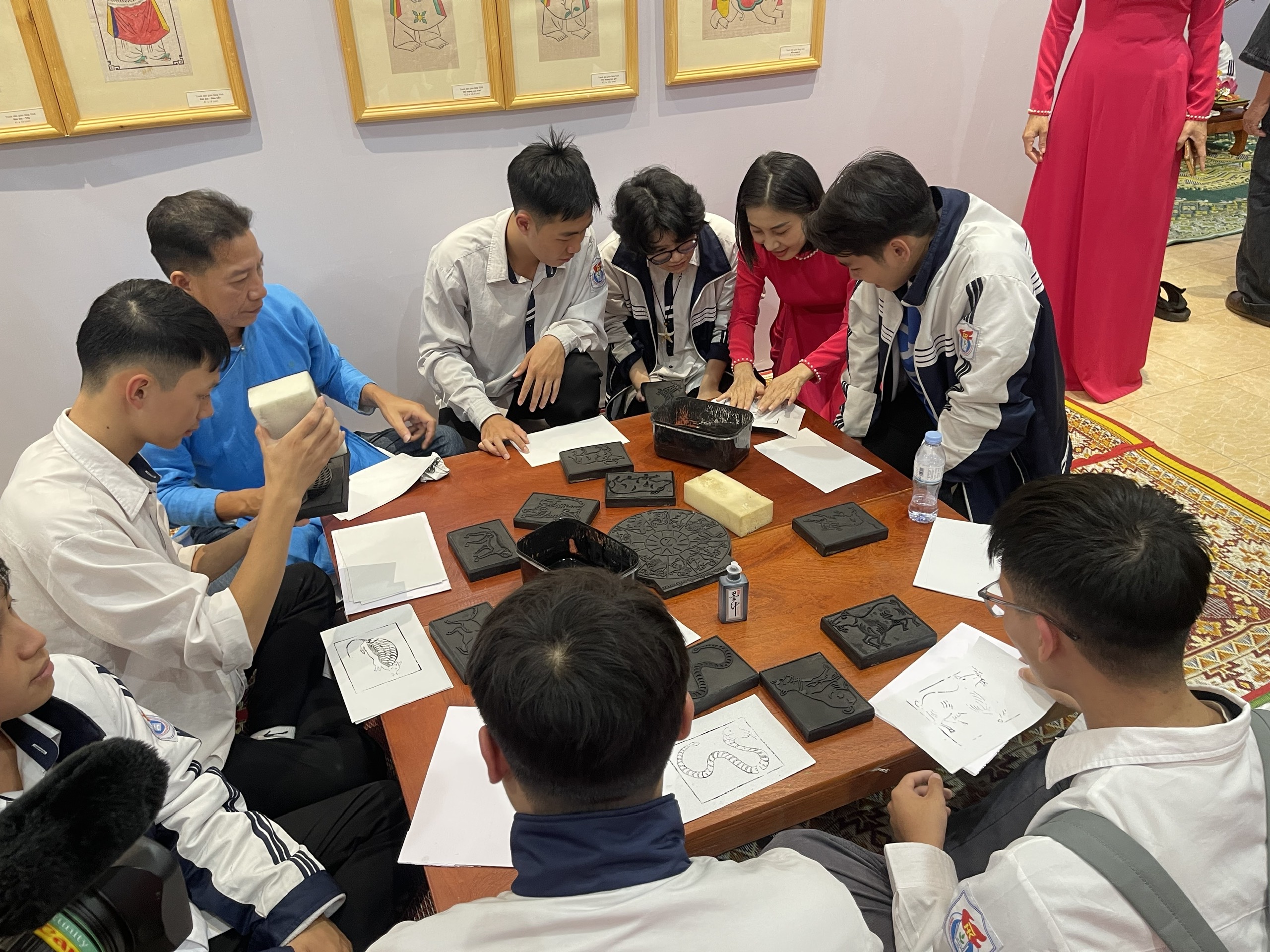 Trực tiếp trải nghiệm in tranh dân gian Làng Sình và các công đoạn làm hoa giấy Thanh Tiên, các em học sinh Trường THPT Huỳnh Thúc Kháng đã rất hào hứng và thích thú.