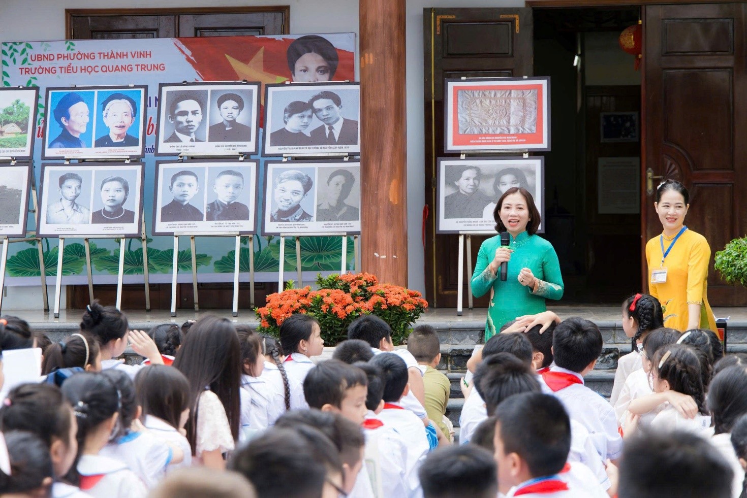 Học sinh Trường Tiểu học Quang Trung, phường Thành Vinh, Nghệ An nghe thuyết minh về Nguyễn Thị Minh Khai tại Nhà lưu niệm